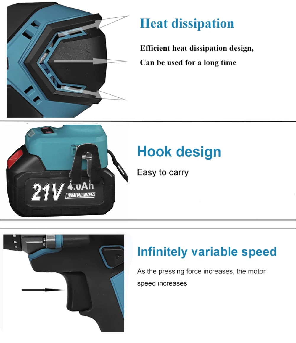 Адаптирован к 18V-21V батареи Makita (Тип батареи: BL1830 / BL1840 /BL1850 / BL1860) Тип электродрели: бесщеточный двигатель, более длительный срок службы и больший крутящий момент. Напряжение: 18-21 в, напряжение батареи 21 в после полной зарядки, если аккумулятор недостаточен, напряжение батареи 18 в
