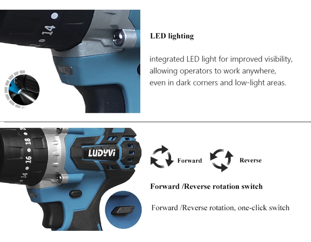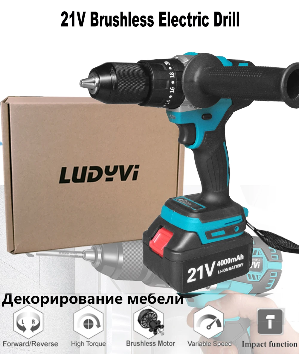 Тип электродрели: бесщеточный двигатель, более длительный срок службы и больший крутящий момент.