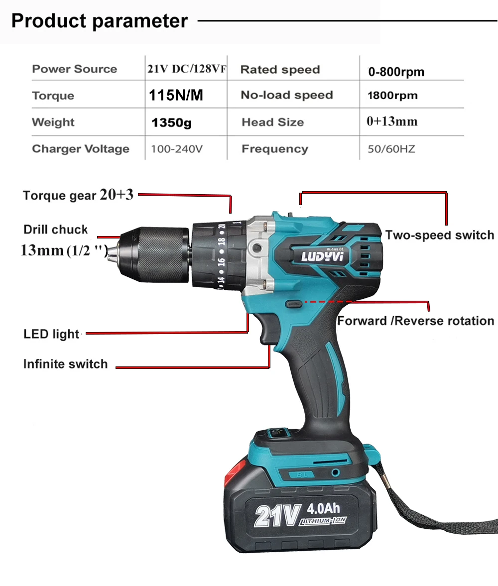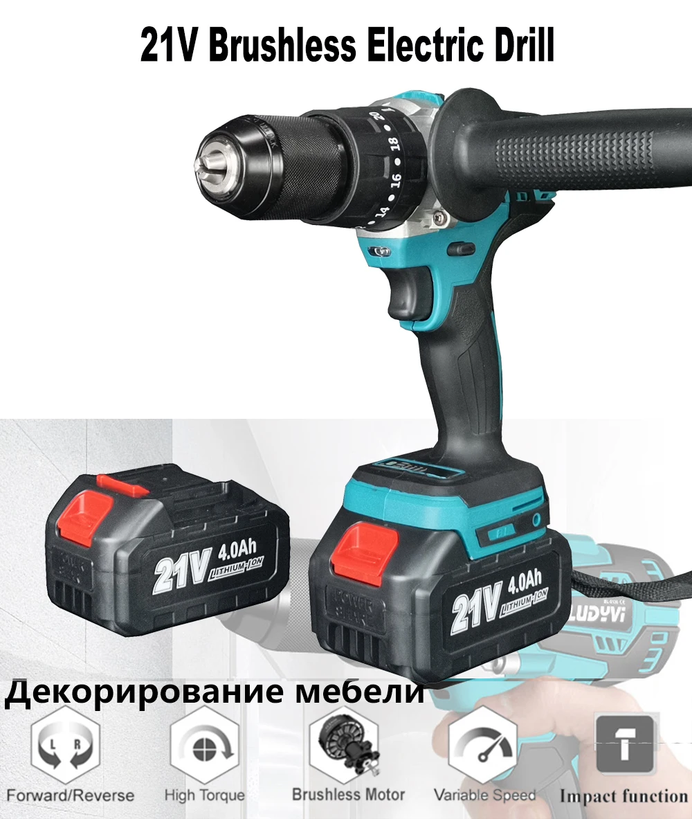 21V 13 мм бесщеточный Электрический сверлильный 115N/M 4000 мА/ч Батарея аккумуляторная
