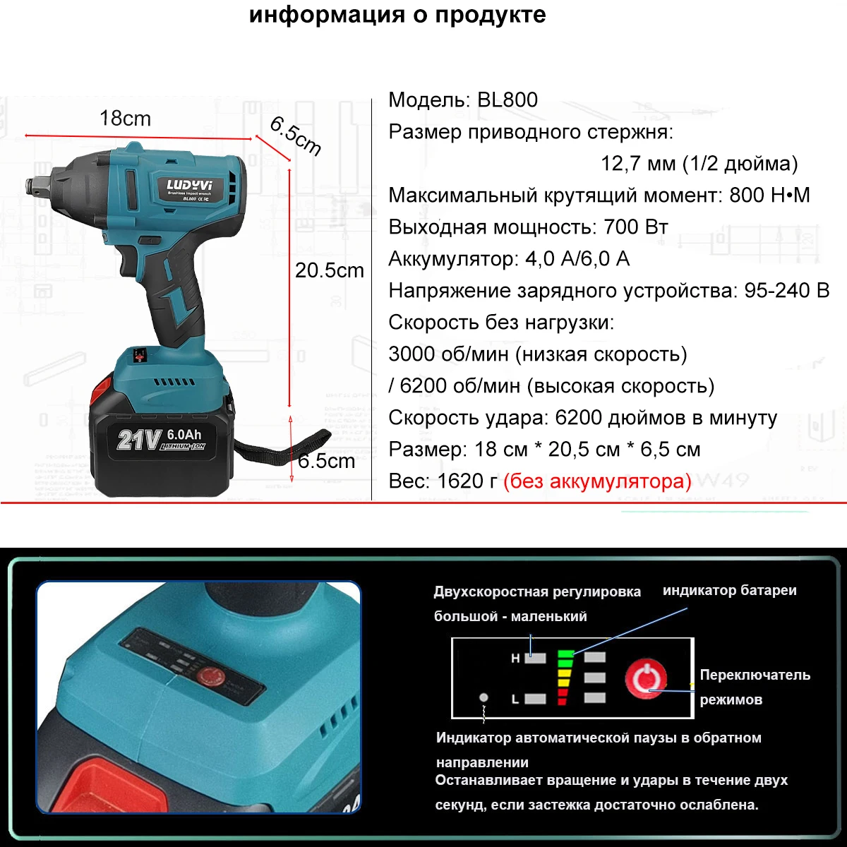 True 800N.m Бесщеточный гайковерт ударный с аккумулятором 21V 6.0Ah акмуляторный