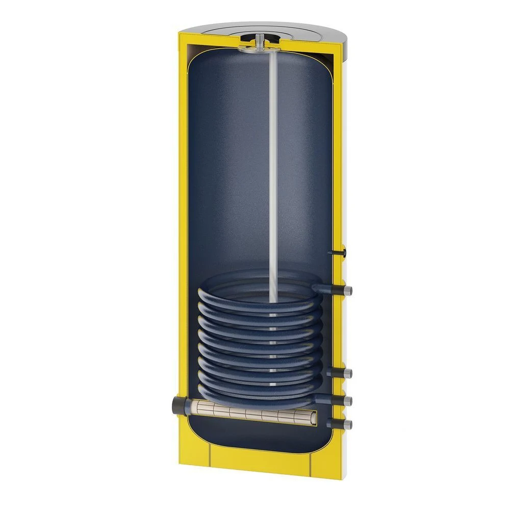 Эмалированный бак косвенного нагрева с одним мощным теплообменником, с рециркуляцией, гильзой под датчик температуры и термометр.