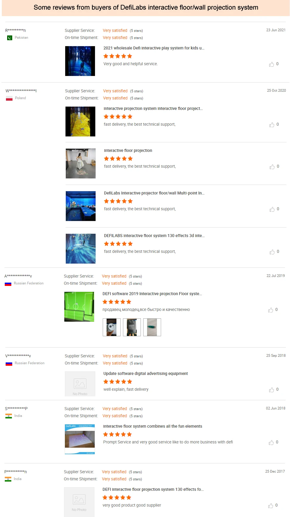 Интерактивная проекционная система, разработанная Nanjing Defi Tech, подала заявку на авторское право на программное обеспечение в 2012 году, и зарегистрированная торговая марка DefiLabs/DfLabs/. Взаимная система поддерживает инфракрасные камеры, лазеры, радары и другие датчики. Максимальный опорный размер-16 проекторов, которые могут выполнять интерактивную проекцию на 50 метров. Наша система поддерживает китайский, английский, русский, корейский, итальянский, арабский, испанский, французский и другие 11 национальных языков и имеет сертификацию CE EU.