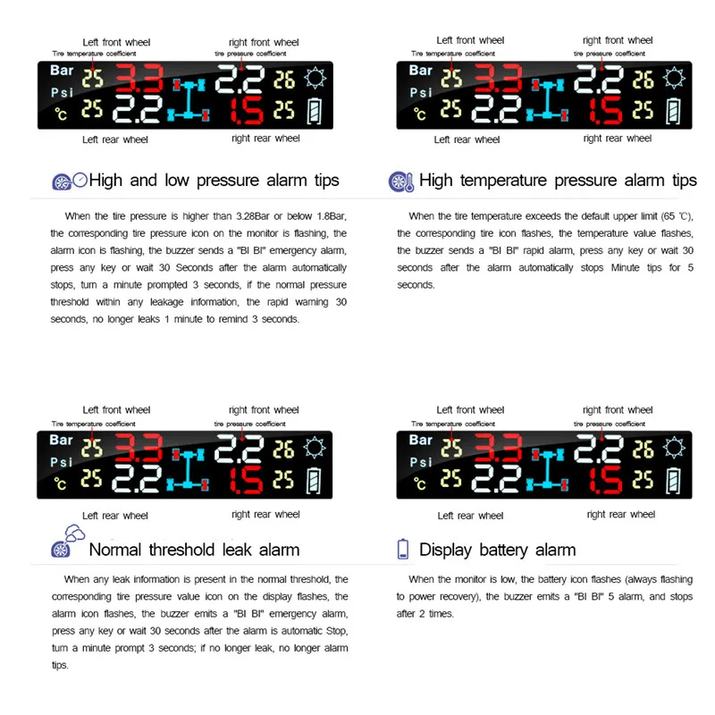 Основные Особенности: -Зарядка от солнечной энергии, отображение цвета ЖК-дисплея, регулируемая яркость -Контроль давления и температуры в реальном времени -Предупреждение о низком давлении воздуха/высокой температуре -Настройка датчика: Узнайте Новый идентификационный код датчика при замене датчика Сенсор Параметры: • Рабочая частота: 433,92 МГц • Рабочая температура: -40 ℃ -120 ℃ • Влажность: от 0% до 100% • Срок службы батареи: внешний датчик> 2 года/30000 км • Рабочее давление: 0 - 99Psi • Давление сигнала тревоги:> 46,5psi или <26,0psi • Точность давления: ± 1,5 psi • Рабочее напряжение: 2,1-3,6 V • Водонепроницаемый: Ip67 Монитор Параметры: • Зарядка от солнечной энергии • ЖК-дисплей отображения • Приклеивается к ветровому стеклу для установки • Рабочая частота: 433,92 МГц ± 50 кГц • Рабочее напряжение: 3,7-5 V • Рабочая температура: -20 ℃ -75 ℃ Примечание: Не включая розничную коробку, если вам нужно, пожалуйста, свяжитесь с нами!