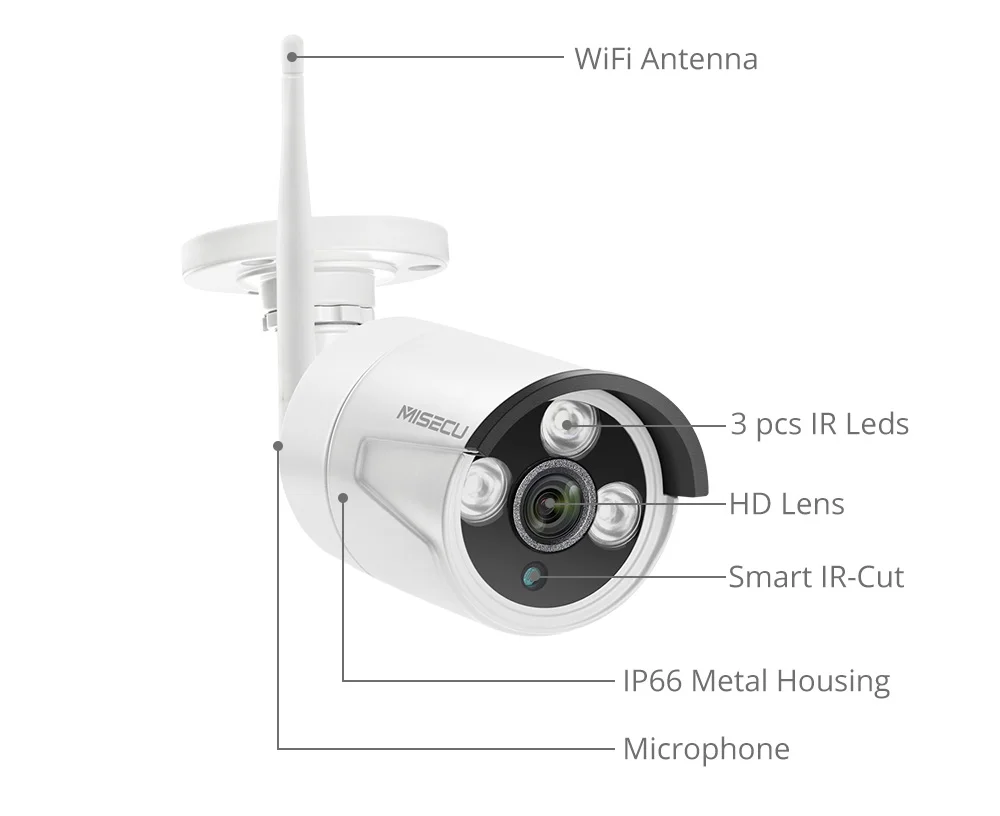 Датчик изображения: 1/2.8 "CMOS с IR-Cut Беспроводные протоколы: 802.11b/g/n, 150 Мбит/с Эффективный пиксель: 2304x1296,3.0MP Объектив: 3,6 мм Количество ИК-светодиодов: 15 шт. ИК-светодиодов (купол Camaera),3 шт. Массив ИК-светодиодов (цилиндрическая камера) Камеры встроены в микрофон