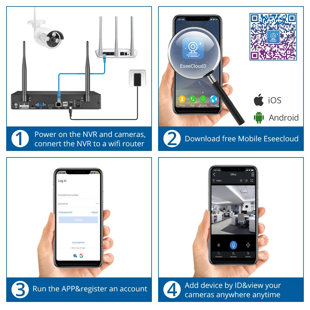 Когда вы выходите на улицу, вам не нужно беспокоиться о безопасности вашей собственности. Используя беспроводную систему видеонаблюдения Hiseeu, вы можете одновременно просматривать видео в реальном времени в любое время и в любом месте с Wi-Fi/4G на смартфоне/iPad/ПК. Загрузите бесплатное приложение «EseeCloud» из Google Play / APP Store, которое легко установить за считанные секунды. Вид ПК/ноутбука: система Windows/ MAC: Программное обеспечение CMS. Вы также можете просмотреть просмотр в режиме реального времени с компьютера через IE.