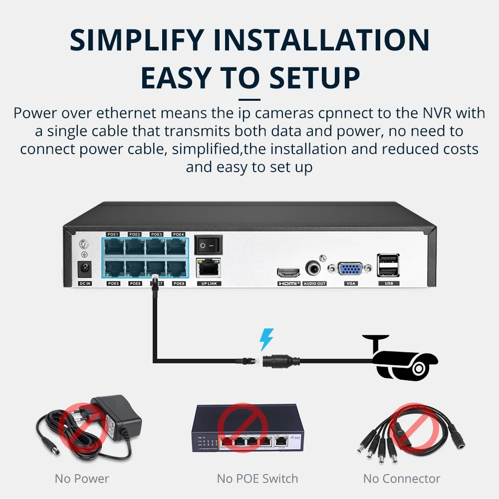 Не нужны дополнительные кабели питания или адаптеры или переключатели. Подключи и работай и простая настройка. Экономьте деньги и удобно, POE NVR = NVR + POE коммутатор