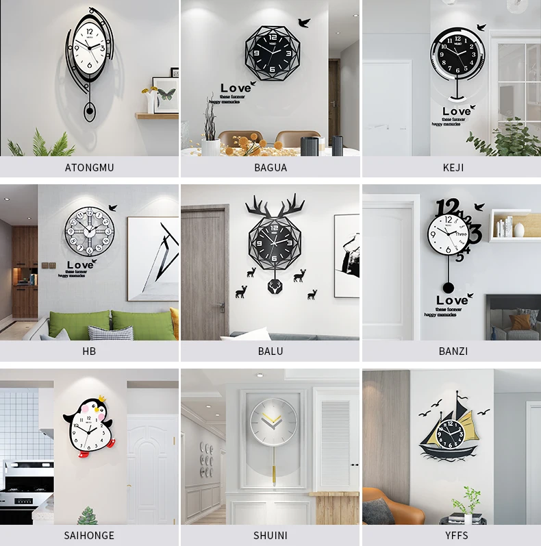1. Цвет: черный декоративный современный дизайн настенные часы винтажные для домашнего декора 2. Материал: RPET акриловые настенные часы для гостиной 3. Бренд: MEISD Топ бренд Swingable настенные часы для гостиной 4. Ядро машины: тихий второй-подметальная машина ядро для часов бренда Meisd 5. Обслуживание: профессиональная команда послепродажного обслуживания